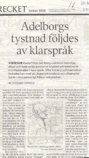 Så Svenska Dagbladet av den 19 februari med Din artikel om Gustaf-Otto Adelborg. Du har i denna artikel på ett utomordentligt sätt plockat fram det väsentliga hos Adelborg som inte bara Malmberg tidigare missat, utan även de flesta andra som känt sig kallade att skriva om honom och hans författarskap.