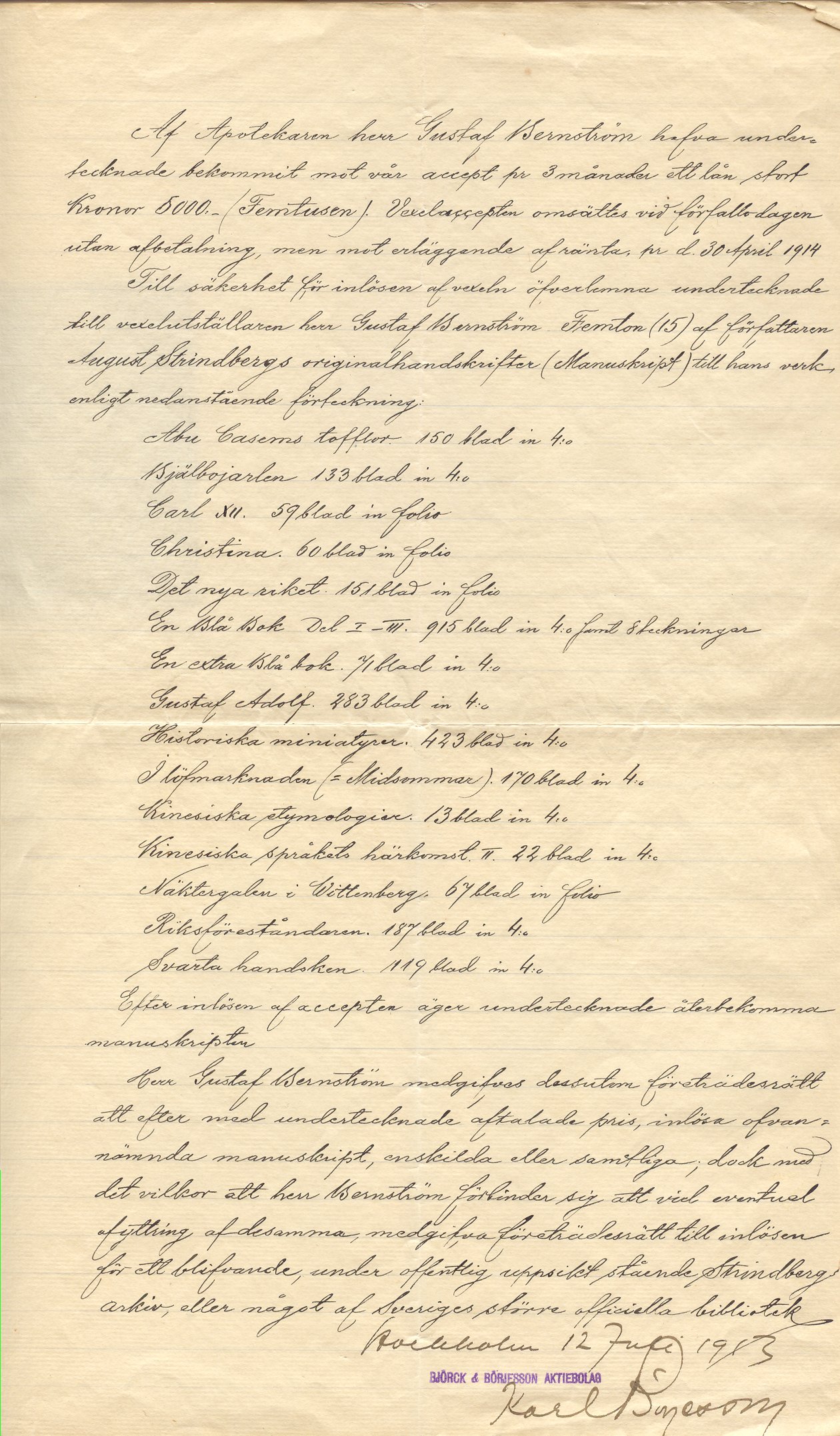 Nedanstående dokument är en lånerevers mellan Karl Börjesson och apotekaren Gustaf Bernström på 5000 kronor, med femton Strindberg-manuskript som säkerhet.